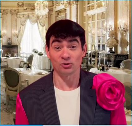 И в очередном эпатажном наряде он сам себя в ресторанном зале поздравляет с днем рождения.