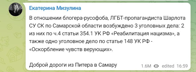 Но что-то всё-таки случилось в его жизни, раз он заторопился обратно на родину с поникшей головой. Стоило Шарлоту ступить на российскую землю, как представители правоохранительных органов сразу же его задержали. Как сообщила своим подписчикам глава Лиги безопасного интернета, Шарлота обвиняют сразу по трём уголовным статьям. "2 из них по ч.4 статьи 354.1 УК РФ «Реабилитация нацизма», а также одно уголовное дело по статье 148 УК РФ - «Оскорбление чувств верующих»(орфография и пунктуация автора сохранены)", - написала она на странице своего телеграм-канала.