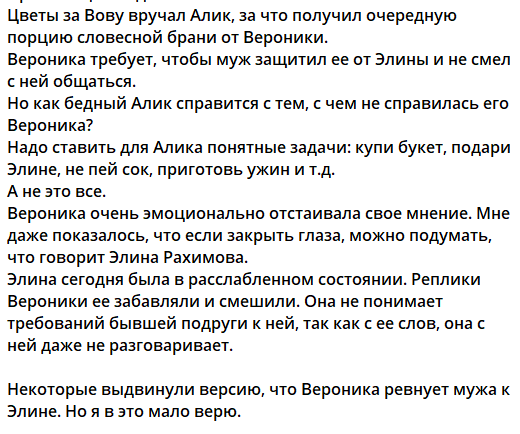 Вроде бы причина агрессии Вероники в сторону Рахимовой объяснима. Элина могла принять цветы от курьера сама, ей мог принести букет Гуранда, но задействовали услужливого Альберта Граковича. Месяц китайских каникул подходит к концу, о чем мы рассказывали на шлоке, а "купидоны" ещё сильней рассорили Граковичей и нервы телебабушки сдали.