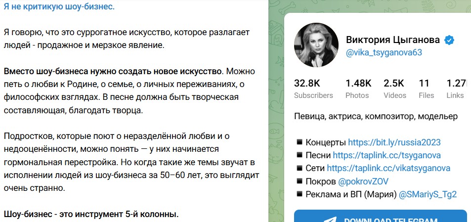 В тот самый момент, когда общественность обратила внимание певицы на возросшую на её странице критику представителей российского шоу-бизнеса, Цыганова пояснила, она не критикует каких-то выдающихся артистов, а просто считает - некоторым не место на сцене перед патриотами своей страны.