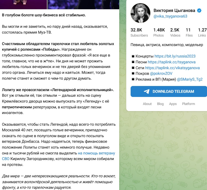 "Счастливым обладателем тарелочки стал любитель золотых куличей с ролексами «Победы». Награждение он глубокомысленно прокомментировал фразой: «Я все еще в топе, главное, что не в ж*пе». Ни дня не может прожить любитель голых вечеринок и не тех дверей без упоминания этого органа. Лечиться ему надо и каяться. Может, тогда полегче станет и сможет о чем-то другом думать.", - прокомментировала Вика получение "тарелки" Филиппом Бедросовичем. "Оказывается, чтобы стать Легендой, надо всего-то потреблять Москалей 40 лет, посещать голые вечеринки, припадочно скакать по сцене в полуголом виде и открыто посылать ветеранов Донбасса. Надо надеяться, теперь финансовое положение Лолиты станет хоть немного получше. Недавно она и тысячи рублей не смогла выделить на помощь ветерану СВО Кириллу Загородникову, которому всем миром собирали на протезы.", - "прошлась" она и по Милявской.