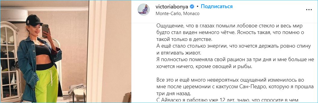 Виктория Боня, после своего участия в первом сезоне телешоу "Звезды в Африке" не перестает эпатировать публику, в том числе и экзотическими практиками, такими как использование кактуса для собственного внешнего и внутреннего самосовершенствования.