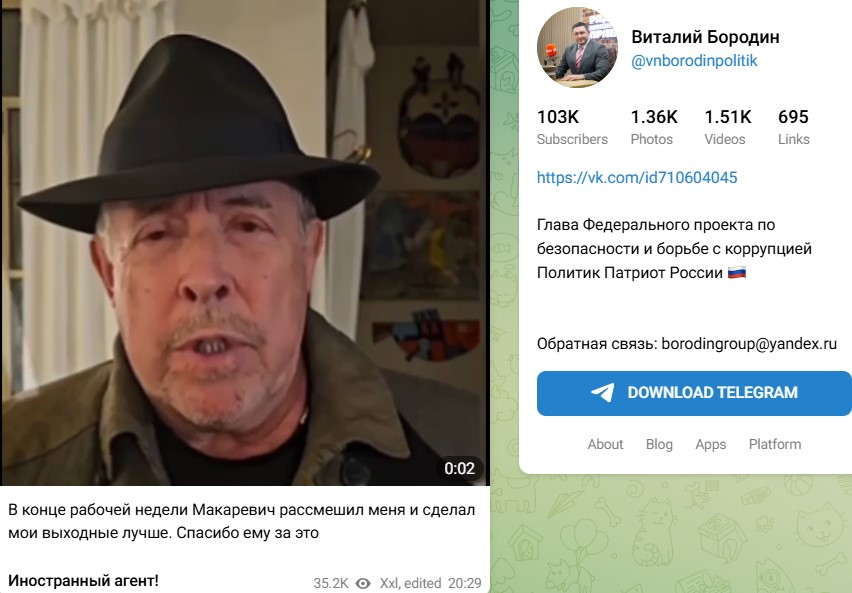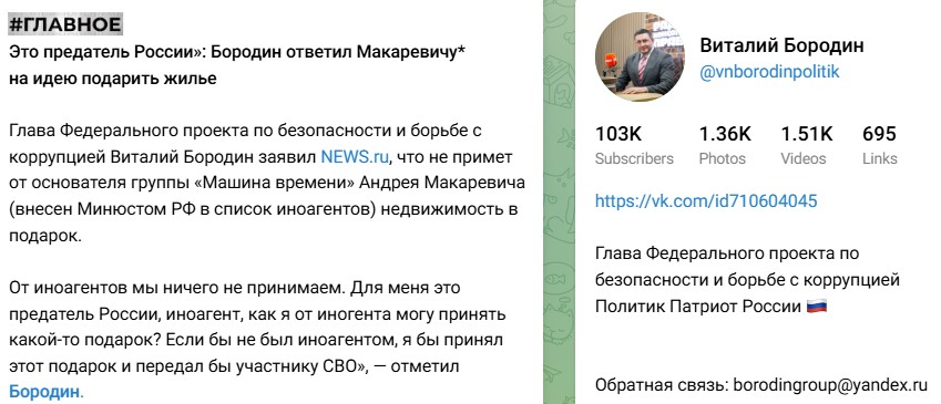 Бородин поторопился ответить Макаревичу, отказавшись принимать подарки из рук предателя и иностранного агента. Если бы Андрей Вадимович не был иноагентом, то в этом случае полученную недвижимость Виталий передал бы нуждающемуся в жилье участнику СВО.