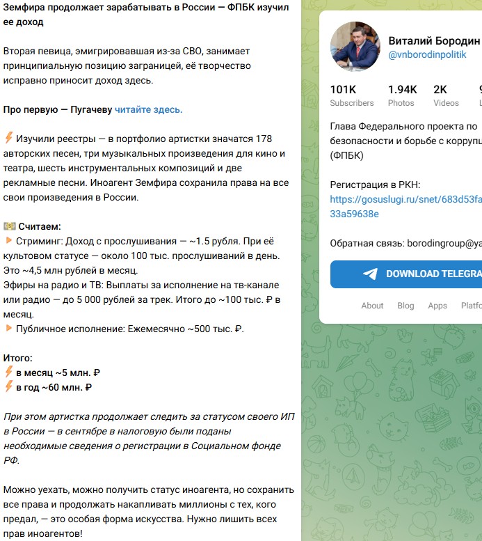"Изучили реестры — в портфолио артистки значатся 178 авторских песен, три музыкальных произведения для кино и театра, шесть инструментальных композиций и две рекламные песни. Иноагент Земфира сохранила права на все свои произведения в России. 💵 Считаем:🔸Стриминг: Доход с прослушивания — ~1.5 рубля. При её культовом статусе — около 100 тыс. прослушиваний в день. Это ~4,5 млн рублей в месяц. Эфиры на радио и ТВ: Выплаты за исполнение на тв-канале или радио — до 5 000 рублей за трек. Итого до ~100 тыс. ₽ в месяц.🔸Публичное исполнение: Ежемесячно ~500 тыс. ₽. Итого:⚡️в месяц ~5 млн. ₽⚡️в год ~60 млн. При этом артистка продолжает следить за статусом своего ИП в России — в сентябре в налоговую были поданы необходимые сведения о регистрации в Социальном фонде РФ(орфография и пунктуация автора сохранены)", - написал на своей странице в социальных сетях Бородин. "Можно уехать, можно получить статус иноагента, но сохранить все права и продолжать накапливать миллионы с тех, кого предал, — это особая форма искусства. Нужно лишить всех прав иноагентов!", - возмутился он.