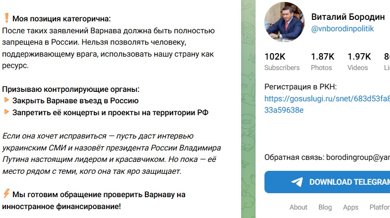 Виталий Бородин призвал закрыть Варнаве въезд в Россию из-за её последних заявлений о президенте Украины. Как считает глава Федерального проекта по безопасности и борьбе с коррупцией, Варнаве не только нужно запретить выступать и зарабатывать в России, но и полностью закрыть ей въезд в страну. Уточняется, речь идёт о словах Варнавы о Зеленском, которого она считает президентом великой страны, гордясь при этом дружбой с ним. Подобные заявления юмористки Бородин считает откровенным предательством по отношению к России.