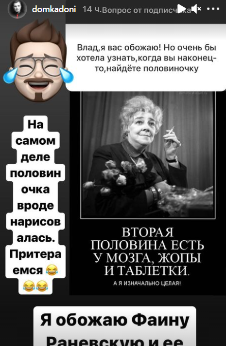 О том, что у Кадони появилась девушка и напрасно на Доме 2 с ним флиртуют участницы, говорила в сторис Кристина Бухынбалтэ. Пока свою избранницу ведущий не показывает поклонникам, но любопытные фанаты Влада уверены, что именно она появилась на секунду в сторис Сергея Пынзаря, заглянувшего в гримерку своего коллеги.