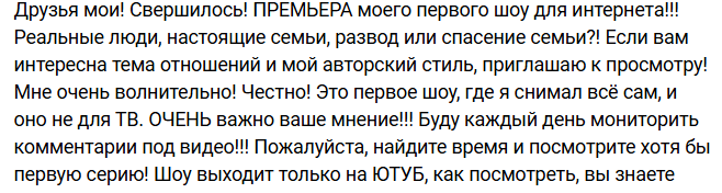 Бывший ведущий телепроекта Дом 2 Влад Кадони рассказал поклонникам о премьере нового авторского шоу. Работая на канале ТВ-3, Кадони активно занимался созданием другого проекта, психологического, посвященного разводам и сохранению брака.