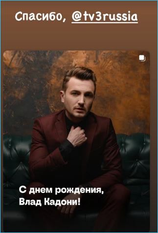 И очень благодарен за поздравления телеканалу ТВ-3, где является ведущим авторского телешоу. Отметились с поздравлениями Андрей Черкасов и Антон Беккужев, многие бывшие участники, с которыми работал на телестройке Влад Кадони.
