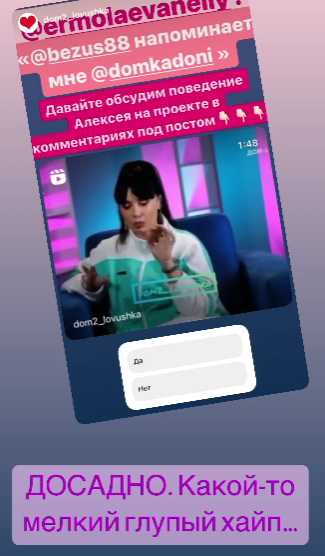 Это вам не Лобное через наушник вести. Владу Кадони не понравилось, как Ермолаева сравнила его с Безусом, бывший ведущий Дома 2 заметил, что Нелли хайпует и выглядит глупо, ему даже досадно видеть то, что что превратилась за последние полгода телестройка.