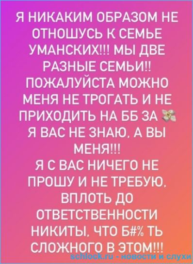Не потому ли что нависла угроза над его собственным пребыванием на шоу, лепечет уже Уманский, что готов вести разговоры, что проблемы надо решать. И что маме и сестре запретил уже реагировать в социальных сетях на поведение и высказывания Насти Паршиной. Вдруг не понадобится телестройке Никита Уманский, как не слишком нужен беременной своей женщине?