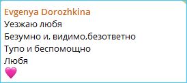 Хотя Женя пишет, что «рассталась любя», удерживать её даже не пытались, Сергей Хорошев преследовать не стал, пара из конкурса вылетела и Дорожкиной пришлось проект покинуть.