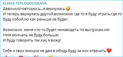 Зато признается Тепловодская, что она постоянно на связи с психологом, с которым консультируется. И еще не решила, будет играть или показывать себя настоящую, как предполагается в рамках реалити-шоу.