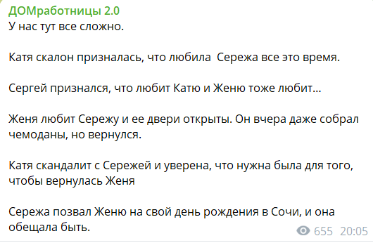 Ведущая Дома 2 Яна Фиткевич поделилась информацией, чтобы зрители Дома 2 не надумывали, кто скандалит в Сочи. Это Екатерину Скалон опять подставили - пригласили на проект, а сейчас предлагают стать третьей лишней. Хорошев использовал Скалон, чтобы вернуть Дорожкину, и Евгения согласилась прилететь к нему на день рождения 17 мая. Очень гордится Дорожкина, что Сергей её любит и она готова открыть ему дверь зза периметром телестройки. Только он в эту дверь не стучит, потому что хочет жить с Женей на проекте.