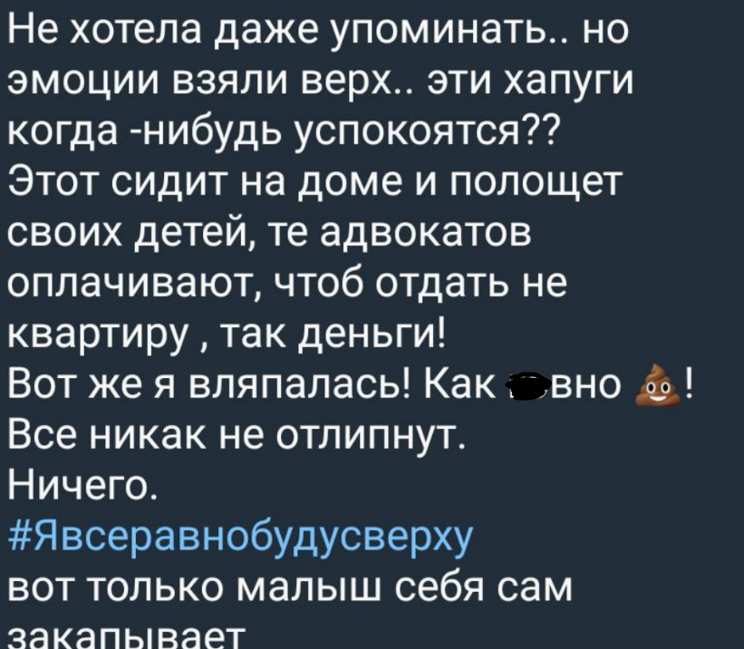 Возмущенная тем, что приходится тратить деньги на адвокатов защиты, Колисниченко начала распускать слухи про мать Тиграна Салибекова, Юлия заявила, что всё равно будет сверху, и поделилась в телеграм-канале с подписчиками давней имеющейся у неё информацией.