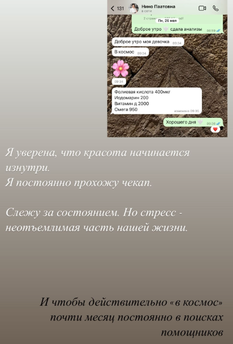 Вторая причина - телеведущая строит дом и улетела из Сочи, чтобы посмотреть, как продвигается ремонт. Также она связалась с Нино Паатовной из клиники, сотрудничающей с Домом 2, чтобы улучшить своё состояние с помощью витаминного комплекса.
