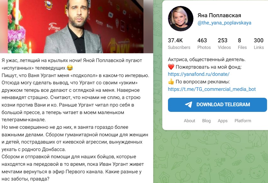 "Пишут, что Ваня Ургант меня «подколол» в каком-то интервью. Отсюда могу сделать вывод, что Ургант со своим «узким» дружком теперь все делают с оглядкой на меня. Наверное ненавидят страшно.", - написала на своей странице Поплавская. "Считают, что ночами не сплю, а строю козни против Вани и ко. Раньше Ургант читал про себя в большой прессе, а теперь читает в моем маленьком телеграмм-канале.", - добавила она.