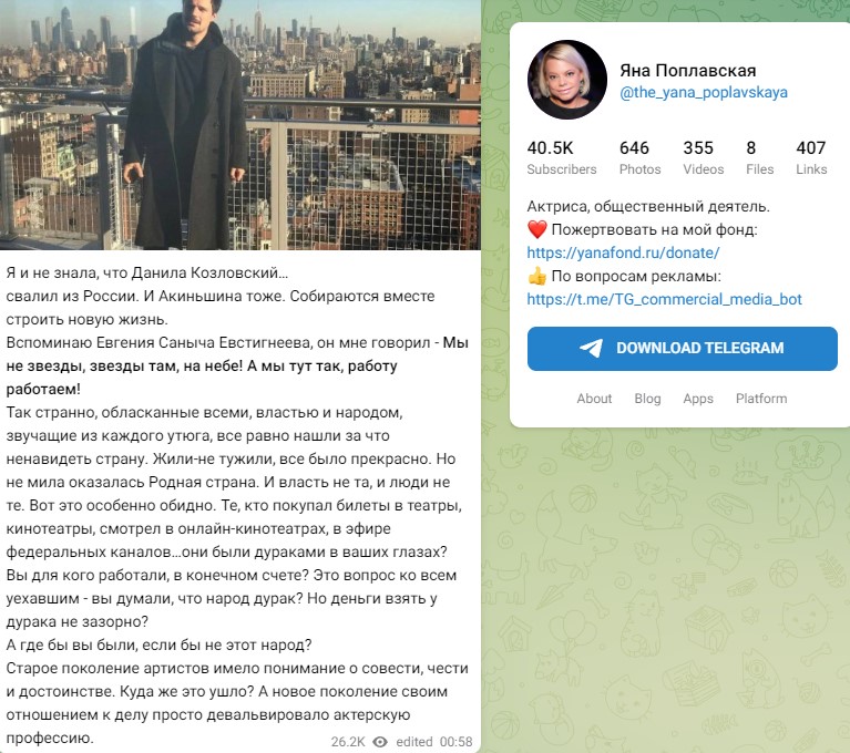 "Так странно, обласканные всеми, властью и народом, звучащие из каждого утюга, все равно нашли за что ненавидеть страну. Жили-не тужили, все было прекрасно. Но не мила оказалась Родная страна. И власть не та, и люди не те. Вот это особенно обидно. Те, кто покупал билеты в театры, кинотеатры, смотрел в онлайн-кинотеатрах, в эфире федеральных каналов…они были дураками в ваших глазах? Вы для кого работали, в конечном счете? Это вопрос ко всем уехавшим - вы думали, что народ дурак? Но деньги взять у дурака не зазорно А где бы вы были, если бы не этот народ(орфография и пунктуация автора сохранены)?", - возмущается "Красная шапочка". "Старое поколение артистов имело понимание о совести, чести и достоинстве. Куда же это ушло? А новое поколение своим отношением к делу просто девальвировало актерскую профессию.", - добавляет она.