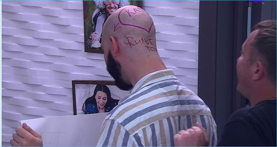 В вечернем эфире 27.04.2025 решил Влад не только с плакатом объявить о своих чувствах к Шмелевой, но и на лысом черепе вспомнил о Виктории Дилье, которого она отвергла.
