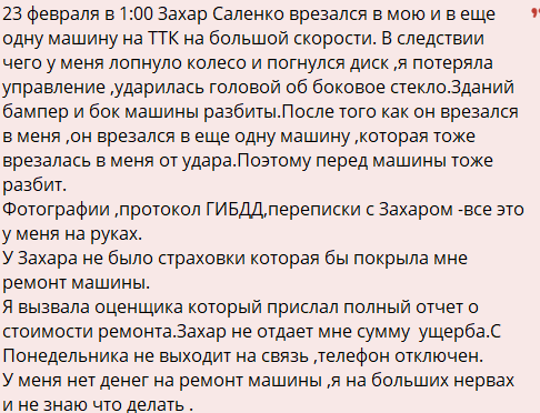По словам пострадавшей, они договорились с Саленко решить вопрос без суда, он обещал выплатить определенную сумму, назначил встречу и проигнорировал звонки и сообщения.