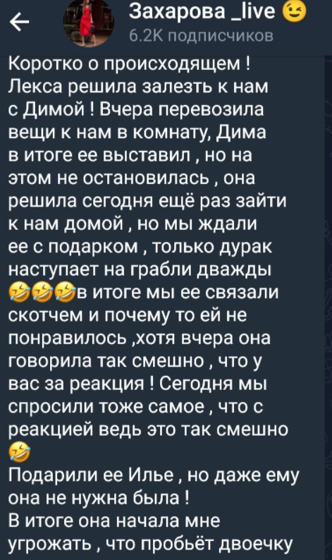 Захарова и сама частенько выступает провокатором и в этой ситуации оказалась главным действующим героем. Она смогла одновременно унизить Сашу и Илью Рыбакова, подчеркнув в своем посте в Телеграмме, что Илья не пользуется авторитетом в коллективе. Как мы уже рассказывали на шлоке, поначалу Рыбаков дружил с Дмитрием Васильевым, почему же Дима позволяет Яне так относиться к его друзьям?