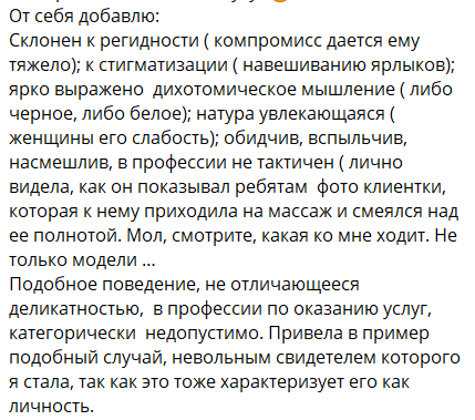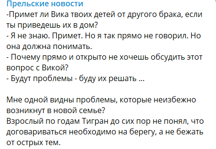 Светлана Прель раскритиковала готовящегося стать отцом Салибекова и опубликовала в своём телеграм-канале пост, в котором передала суть разговора с обидчивым и вспыльчивым, по её мнению, Тиграном. "Жена и дети для Тиграна не навсегда." - считает психолог, так как первая семья у него была разрушена из-за того, что в споре с супругой Юлией Колисниченко он встал на сторону своей матери.