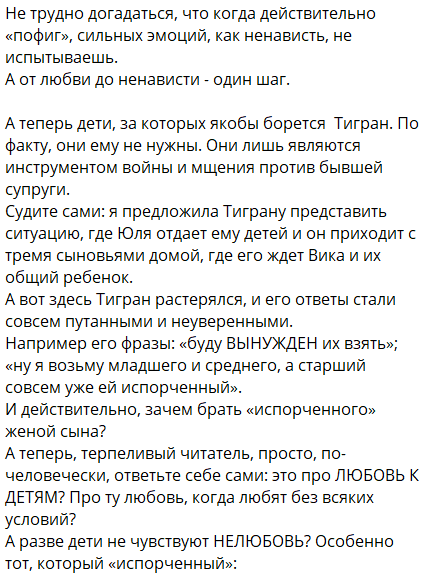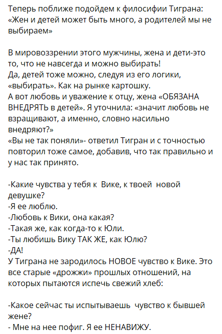 Главная задача Тиграна - вовремя платить алименты, а вопрос воспитания и общения с детьми не его дело - считает Колисниченко-Салибекова. О каких оценках Тиграна, как отца, может идти речь? Возможно, и Лысковец ждёт судьба Колисниченко, так как Тигран выбирает женщин одного типажа?